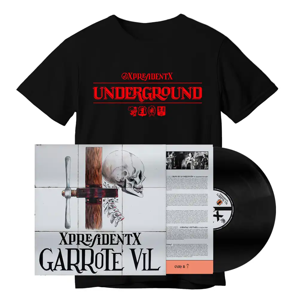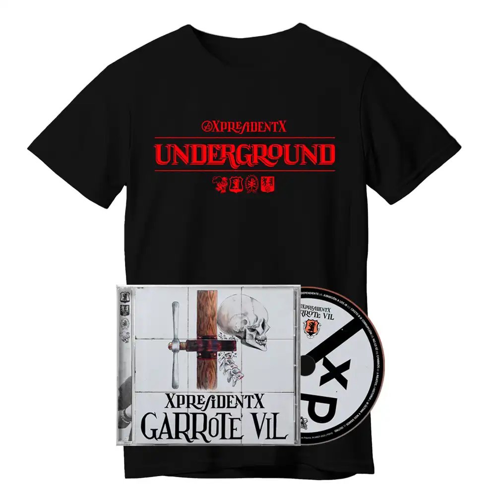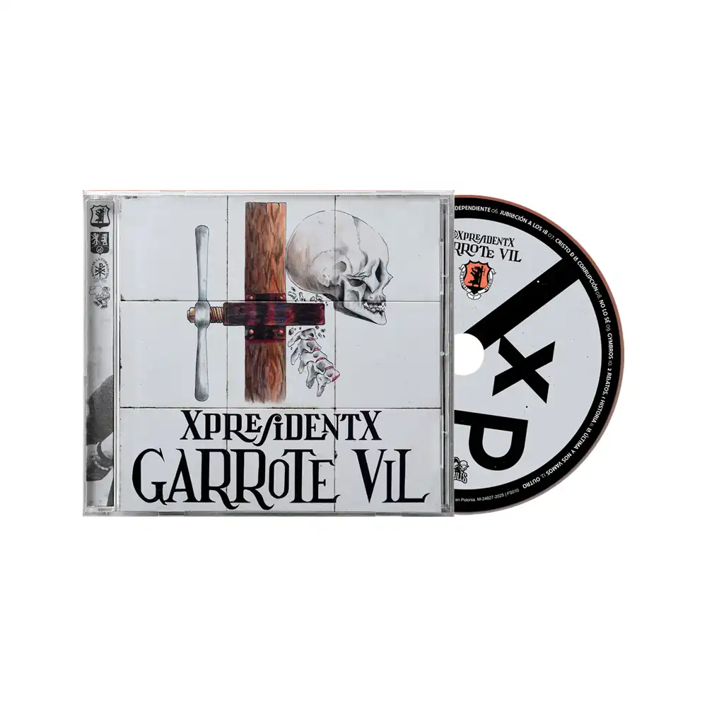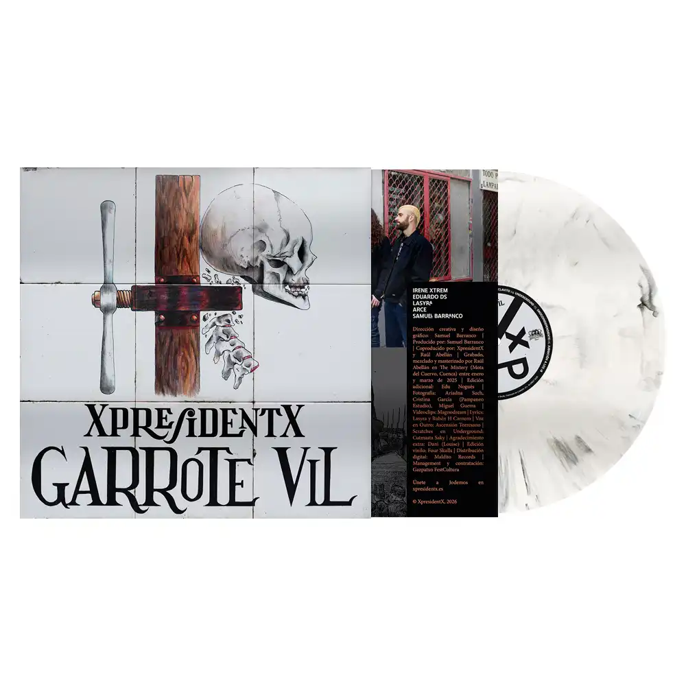 Garrote Vil es el quinto disco de estudio de la banda de rap metal XpresidentX. Tras el lanzamiento de los adelantos “La última y nos vamos“, “No Vengas a Madrid” y el recién lanzado “Underground” se abre la preventa de su trabajo más potente. Esta formado por 12 cortes en la linea de la banda donde la crítica social se funde con el humor negro. Grabado, mezclado y masterizado por Raúl Abellán en los estudios The Mixtery. Ha sido producido por el propio Samuel Barranco, que además se encarga de todo el artwork del disco y co producido por XpresidentX junto a Raúl. En este trabajo han contado con las colaboraciones de Lucy en “Drogoindependiente”, Zequione de Narco en “Cristo de la Corrupción”, Dania Neko en “2 Relatos. 1 Historia” y Cutmasta Saky que pone los scratches en “Undergorund”. El disco se lanza el 30 de enero de 2026 y tenemos el honor de poder editarlo en formato físico. Saldrá en CD en una edición limitada a 200 copias en formato Jewell Box con libreto de 12 páginas y en vinilo. Las dos ediciones en vinilo son limitadas y numeradas. Una edición en vinilo negro limitada a 200 copias y una exclusiva Four Skulls en vinilo en blanco con marmoleado negro. Ya puedes reservar tu copia y te lo mandamos a casa en la semana del lanzamiento. Sin lugar a dudas el mejor trabajo de XpresidentX!! Por favor, si tu elección no incluye color o talla, selecciona en ambas variables “No Aplica”. Gracias